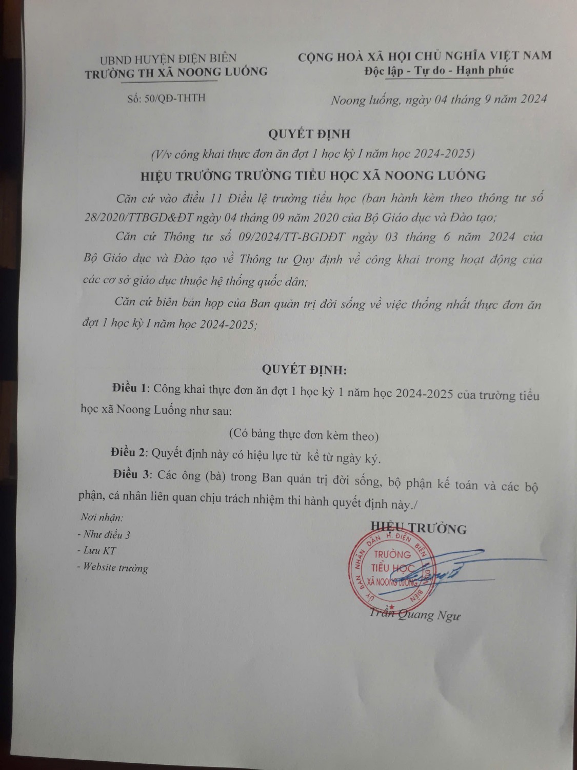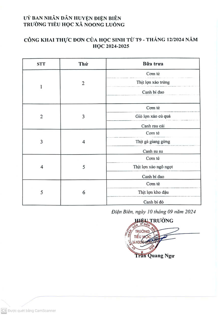 CÔNG KHAI THỰC ĐƠN ĂN ĐỢT 1 NĂM 2024